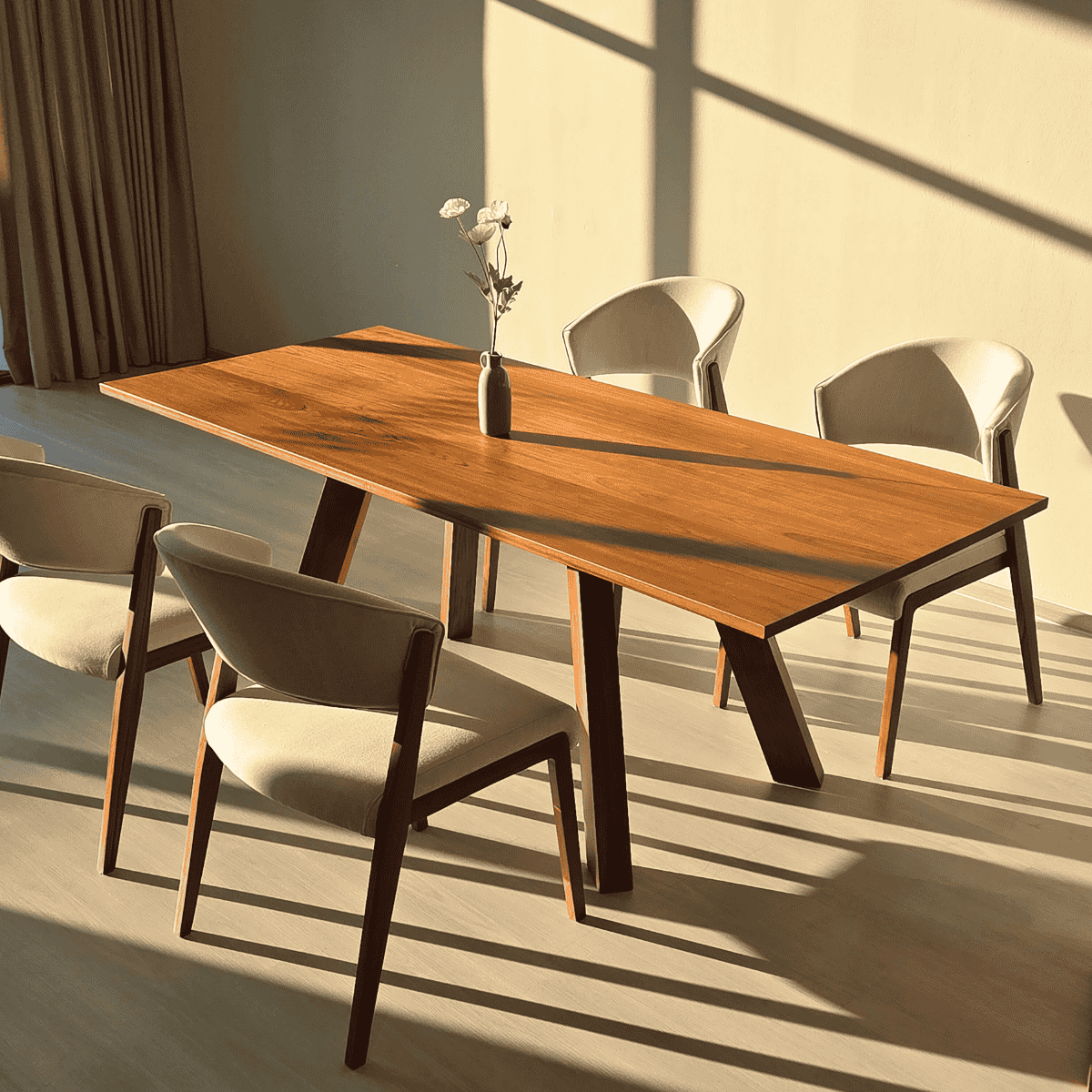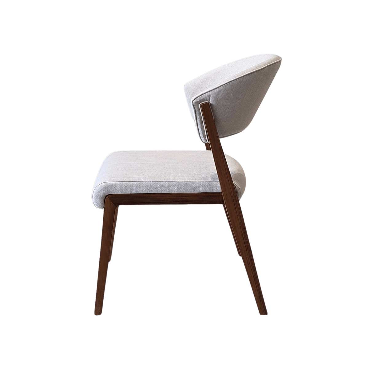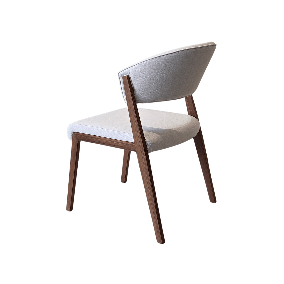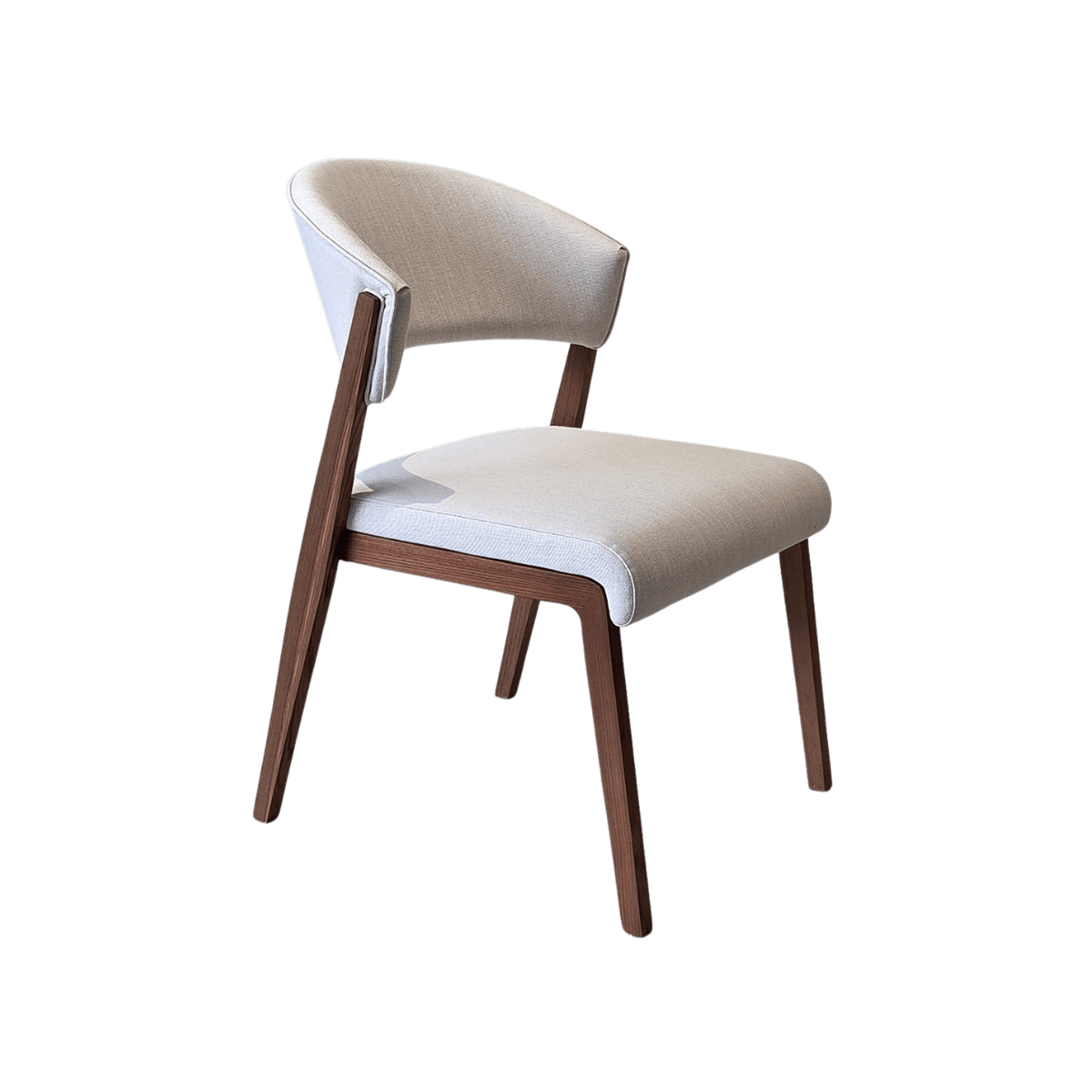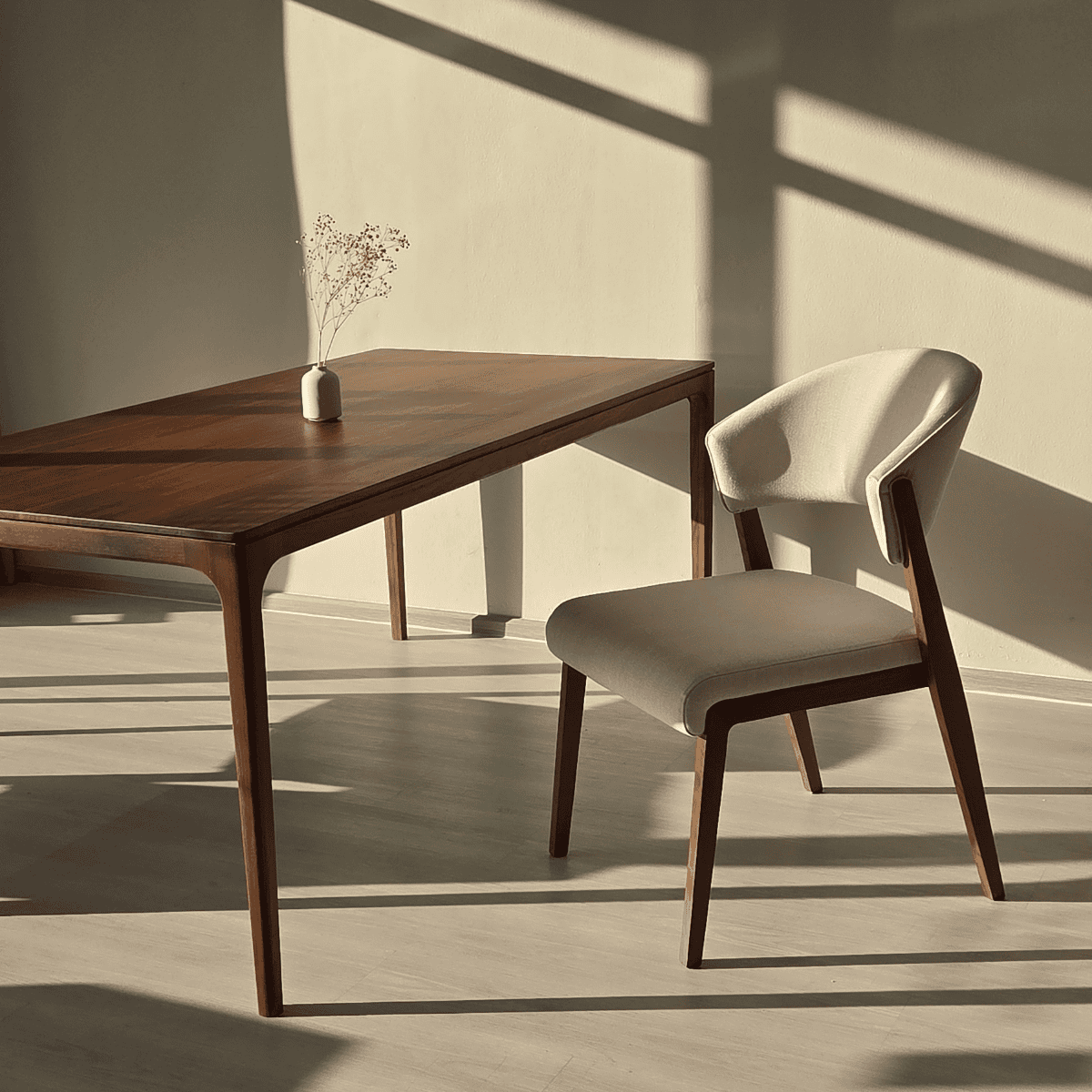 เก้าอี้ทานอาหารดีไซน์ผสานโครงไม้สักทองเข้ากับเบาะหุ้มผ้าโทนสว่างอย่างลงตัว พนักพิงโค้งรับแผ่นหลังอย่างพอดี ให้ความรู้สึกเบา โปร่ง และนั่งสบาย ขาไม้ทรงเรียวช่วยลดน้ำหนักสายตา เหมาะสำหรับพื้นที่ทานอาหารที่ต้องการความเรียบ หรู และอบอุ่นในแบบร่วมสมัย สามารถเลือกวัสดุหุ้มได้ทั้งผ้า VC Fabric, PASAYA หรือหนัง Zoft Leather