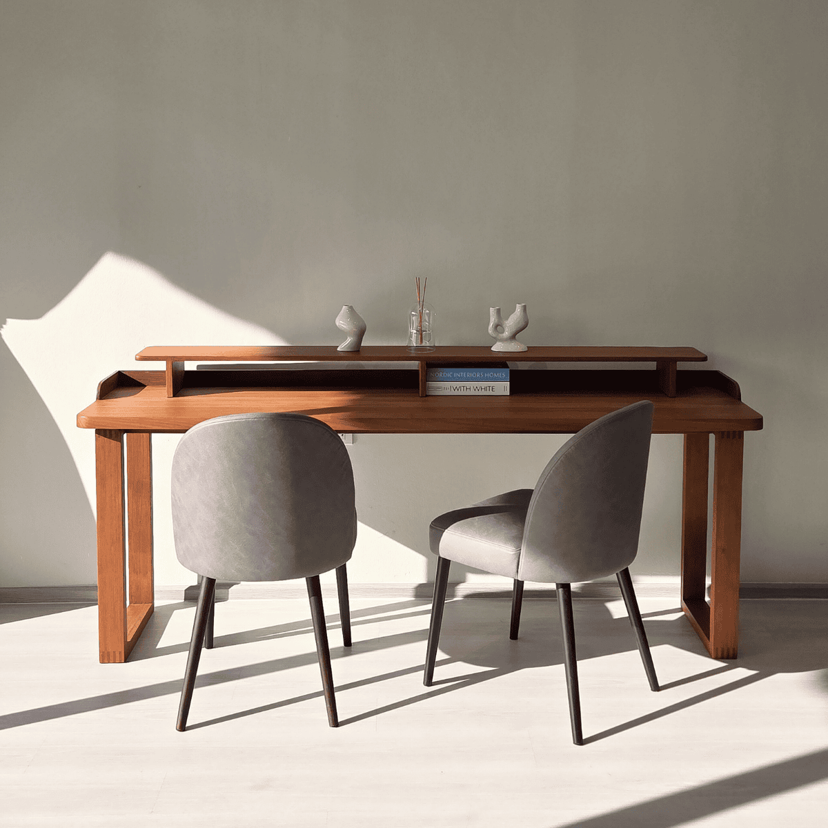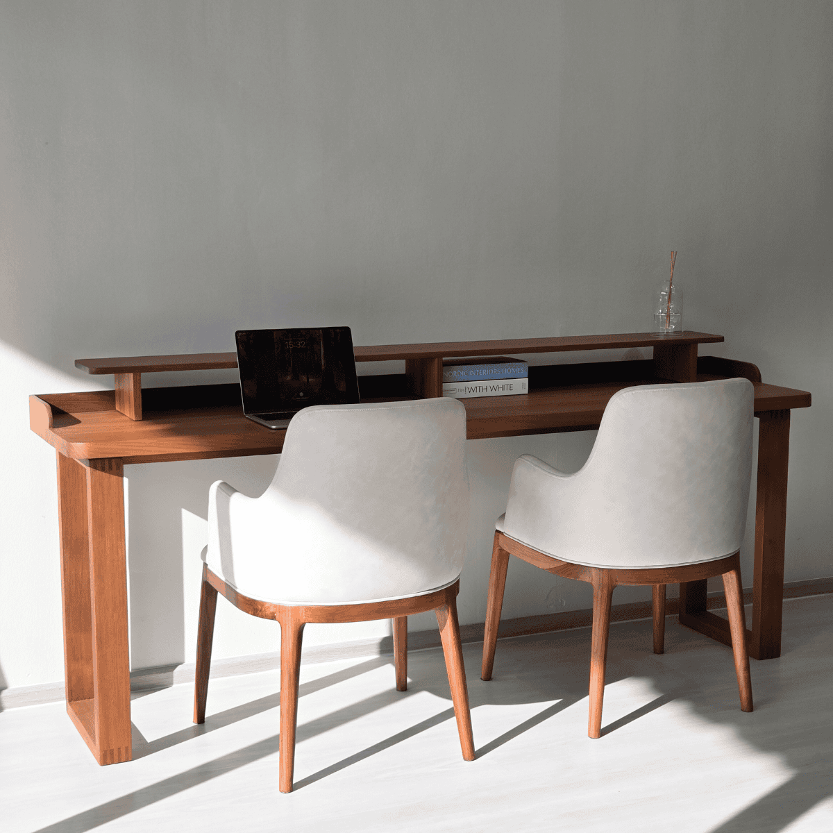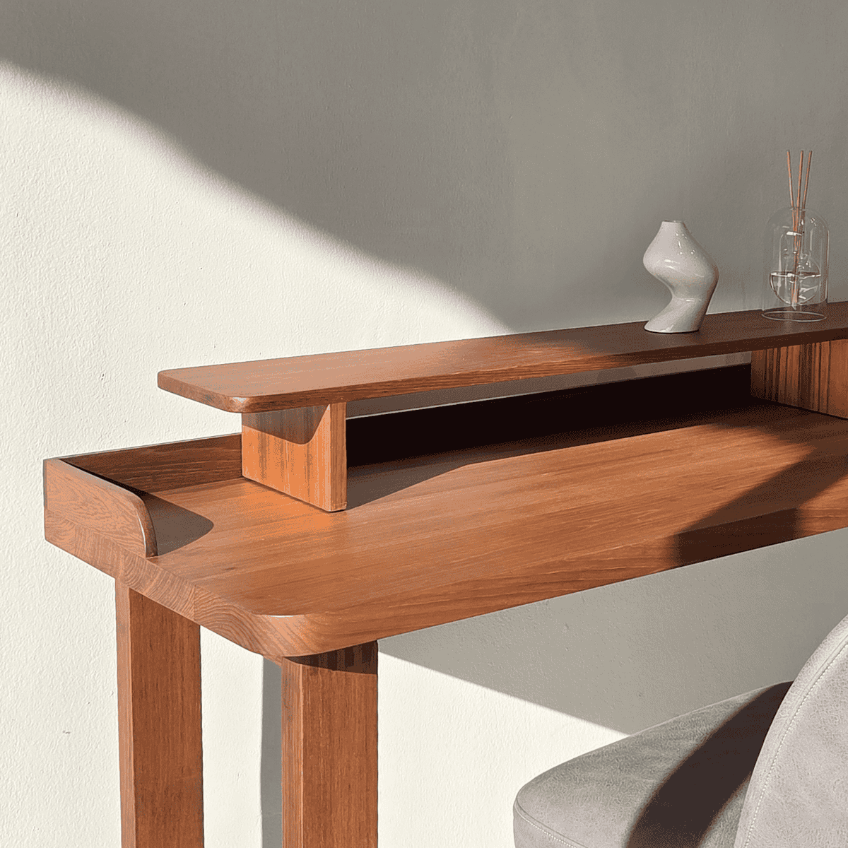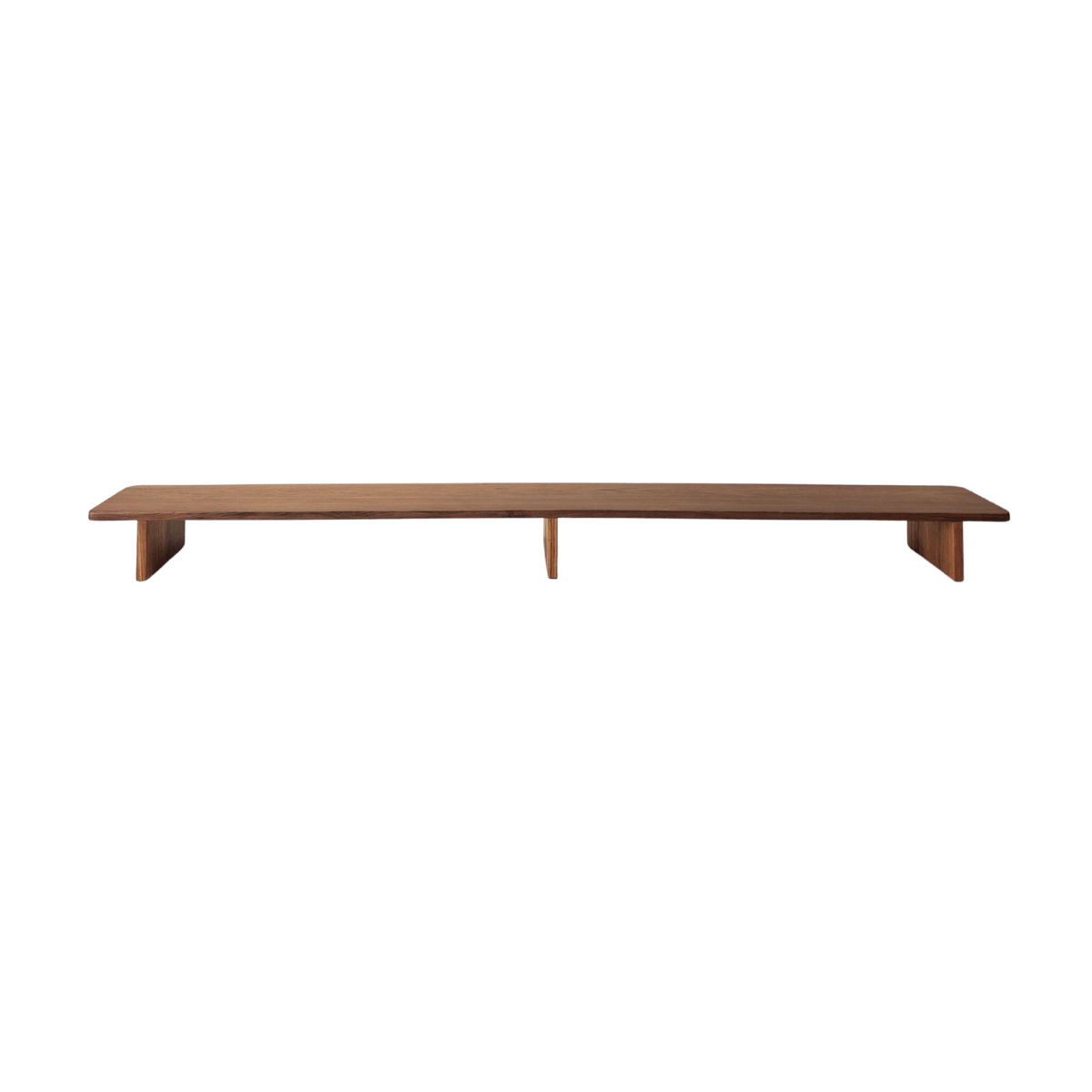 ชั้นวางบนโต๊ะทำงานหรือชั้นวางมอนิเตอร์ ไม้สักทองพม่าที่ออกแบบให้ใช้งานคู่กับ Cavern Desk หน้าชั้นไม้สักหนา 1 นิ้ว ให้ความมั่นคงและสมดุล ขอบมนช่วยลดความแข็งของเส้นสาย ทำให้พื้นที่ทำงานดูสงบ เป็นระเบียบ และกลมกลืนกับโต๊ะตลอดการใช้งาน