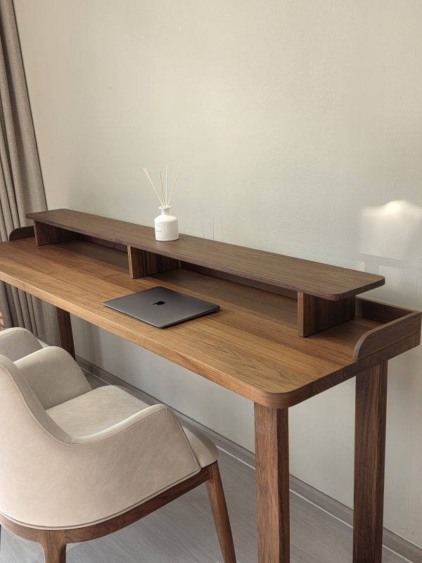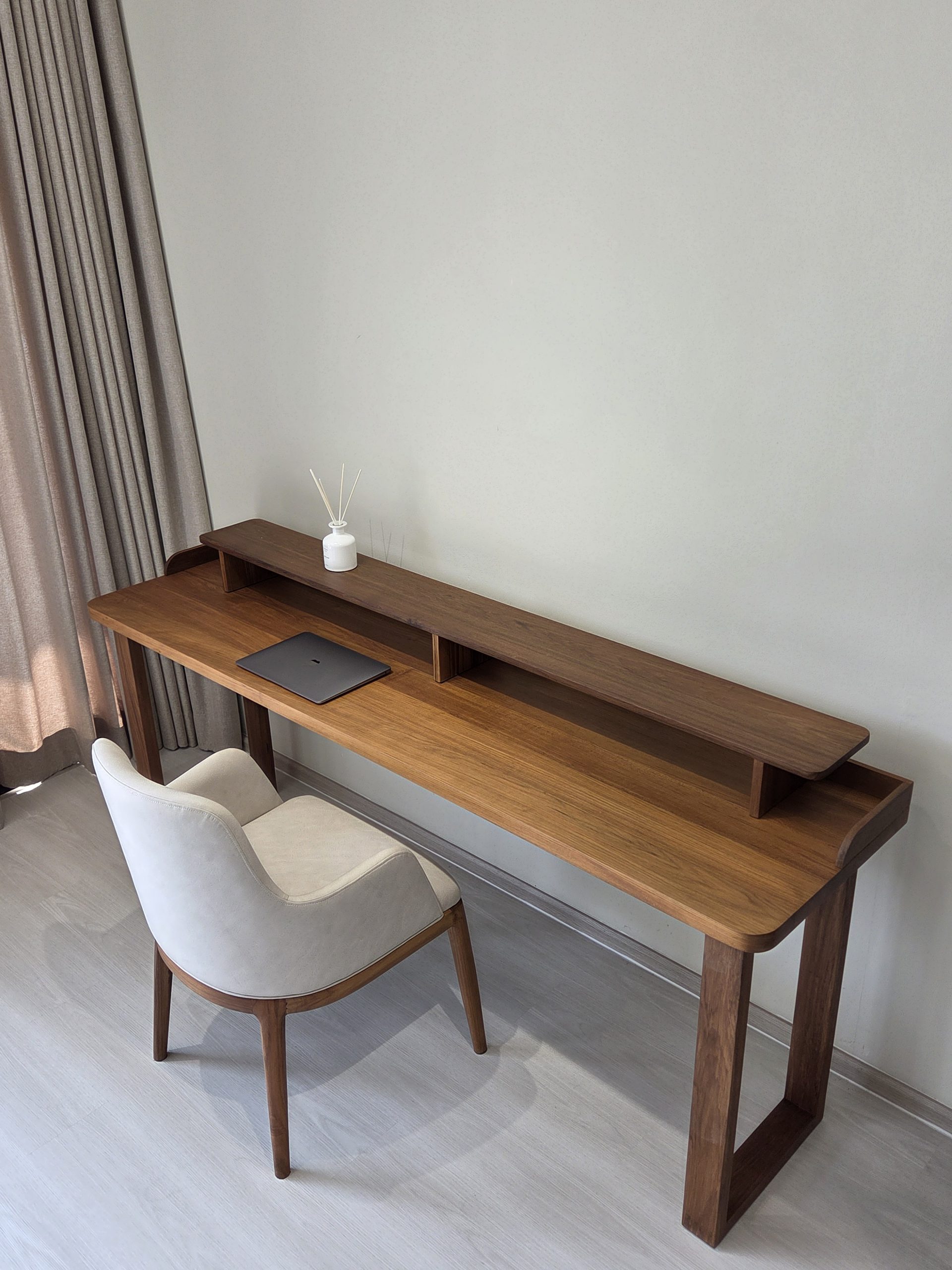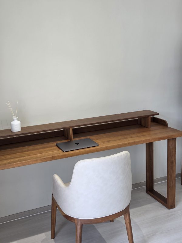 Cavern Desk Shelf ชั้นวางบนโต๊ะไม้สัก เข้าชุดโต๊ะทำงาน Cavern Table หน้าชั้นวางทำจากไม้สักทองหนา 1″ ออกแบบให้ขอบมีความมน เข้ากับชุดโต๊ะทำงาน