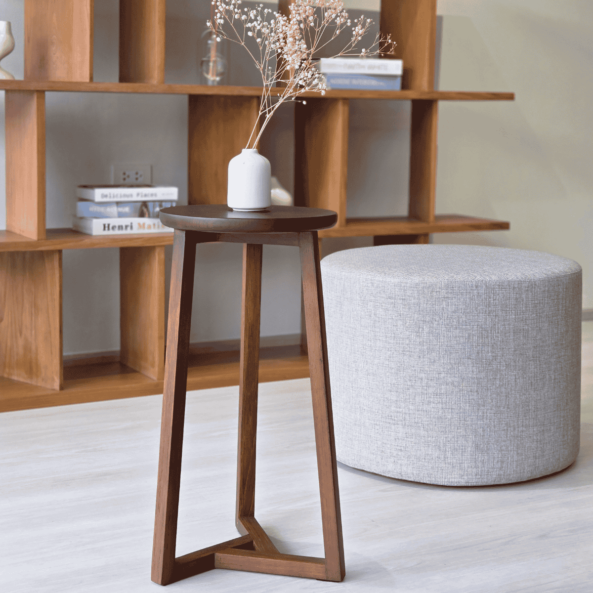 โต๊ะข้างไม้สักทองพม่าที่โดดเด่นด้วยดีไซน์ขาโต๊ะทรง Triangle-Leg เรียบแต่มีคาแร็กเตอร์ สัดส่วนถูกออกแบบให้ดูเบาและมั่นคงในเวลาเดียวกัน เหมาะสำหรับวางข้างโซฟาหรือเก้าอี้อาร์มแชร์ เติมรายละเอียดของงานไม้แท้ให้พื้นที่ดูมีชั้นเชิงโดยไม่ดึงความสนใจเกินจำเป็น