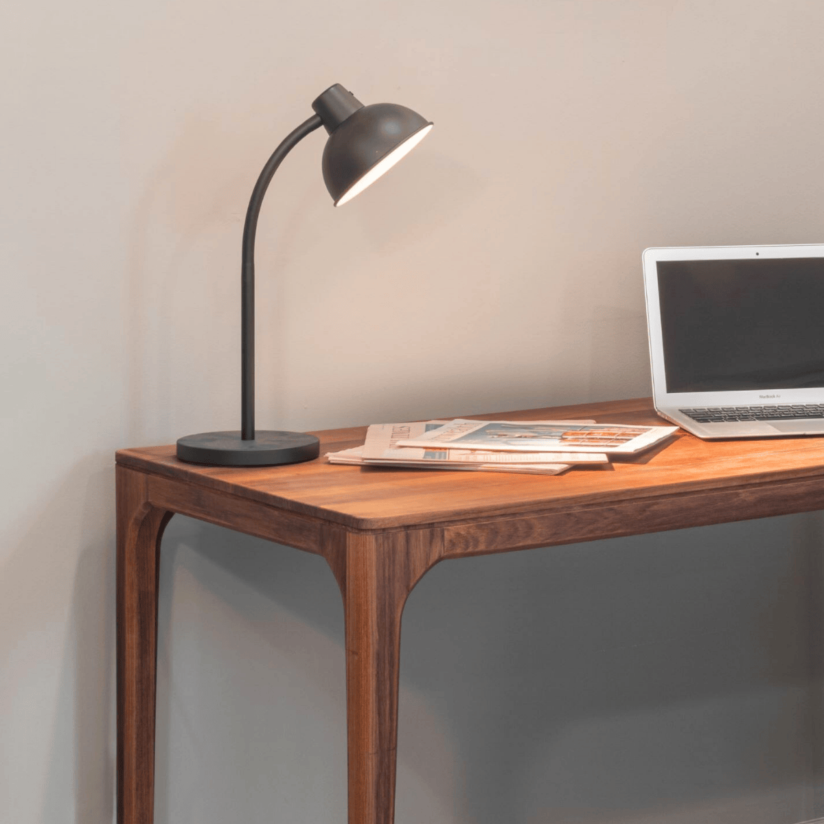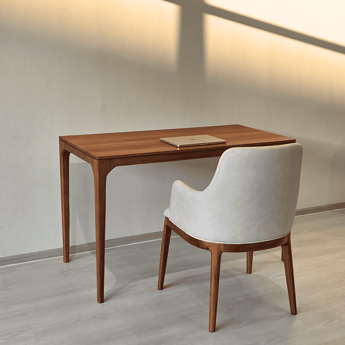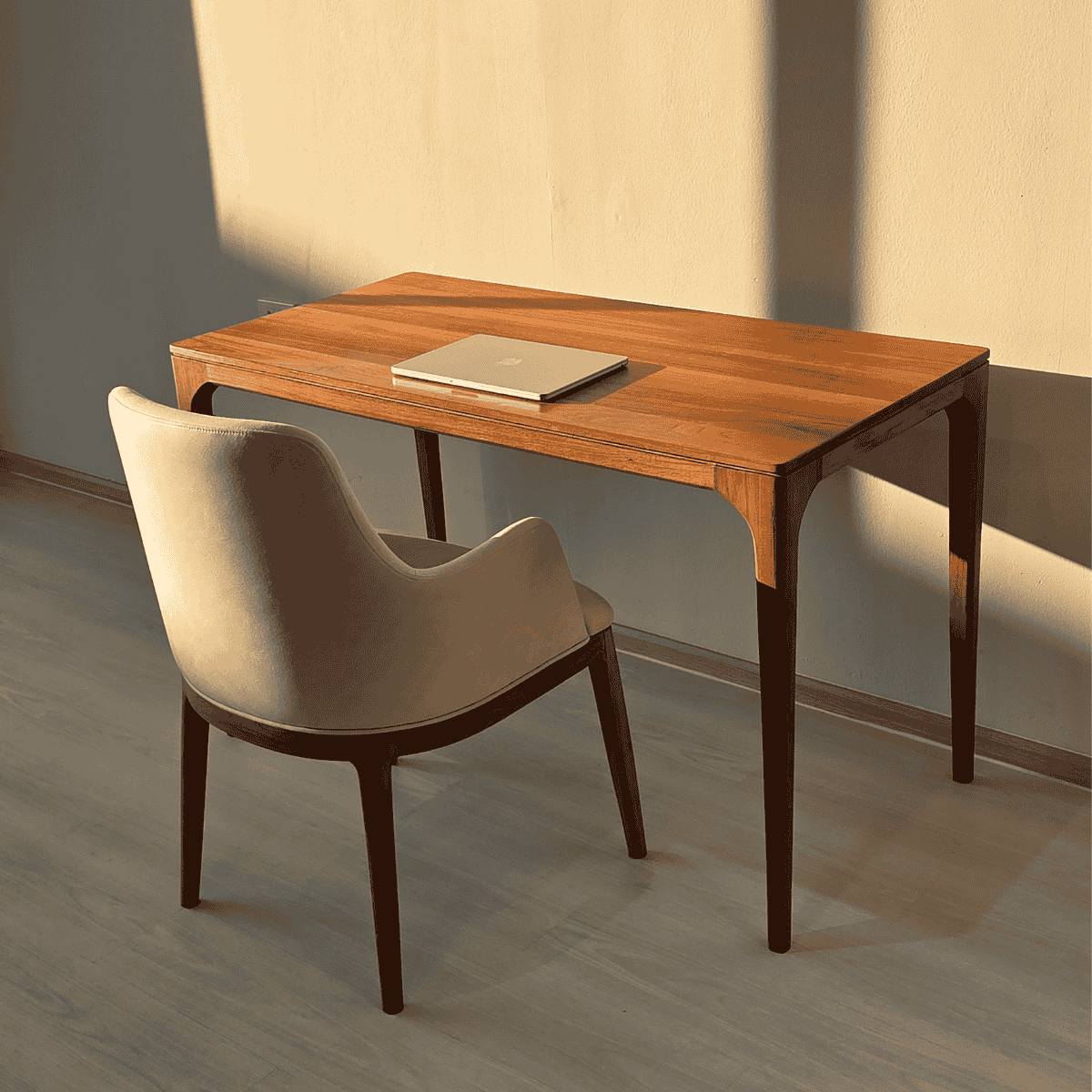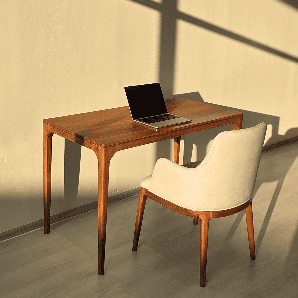 โต๊ะทำงานไม้สักดีไซน์เรียบ ขาโต๊ะวางชิดมุมช่วยให้พื้นที่โปร่งโล่ง ขอบโค้งมนใช้งานสบาย เหมาะกับพื้นที่ทำงานที่สงบและร่วมสมัย