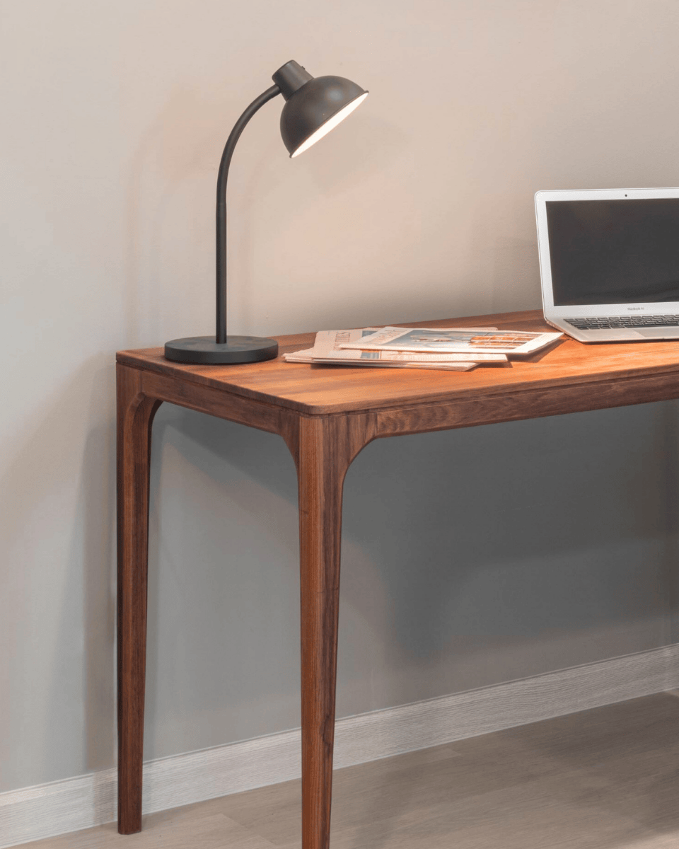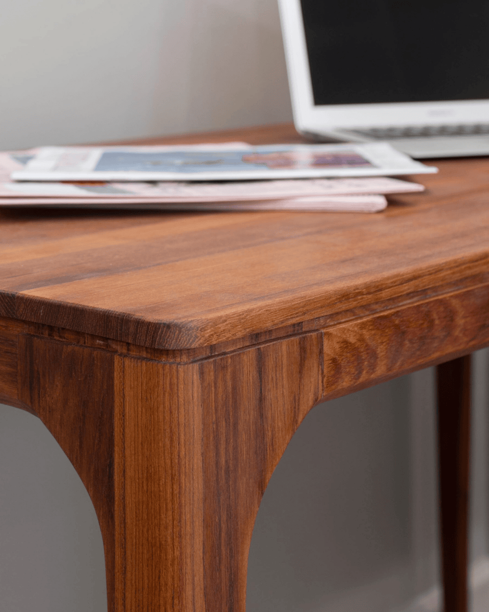 โต๊ะทำงานไม้สักที่ให้บรรยากาศ Mid-Century Modern ด้วยการการออกแบบที่เน้นความเรียบและสมดุลในทุกจุด ขาโต๊ะถูกวางชิดมุมเพื่อเปิดพื้นที่ใช้สอย ขอบโต๊ะโค้งมนเล็กน้อยเพื่อให้สัมผัสนุ่มมือ